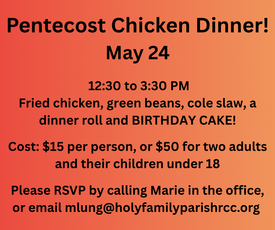 Pentecost is the birthday of the Catholic Church.  Please plan to join us for a celebration dinner!